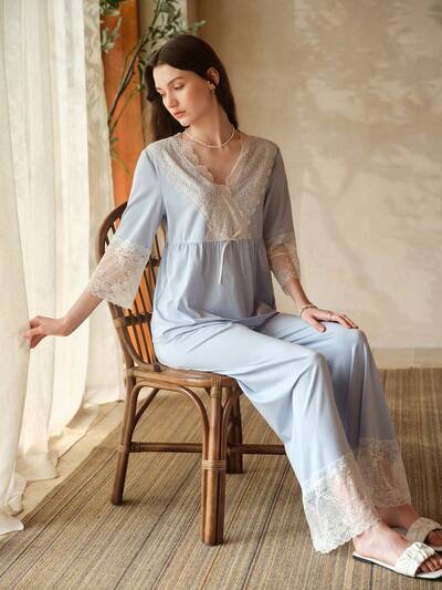 2PCS WOMEN COMFY CONTRAST LACE LOUNGEWEAR SET-18%