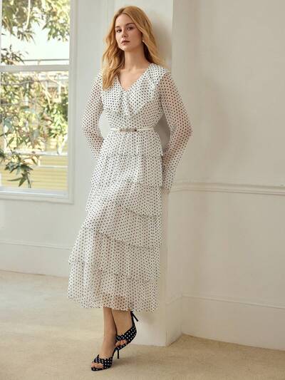 POLKA DOT PRINT V-NECK FLARE SLEEVE LAYERED RUFFLE HEM DRESS WITH BELT-52%