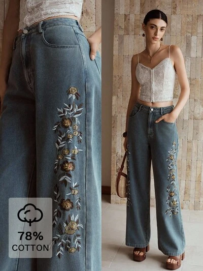 EMBROIDERY FLORAL PATTERN SLANT POCKET WIDE LEG JEANS-57%