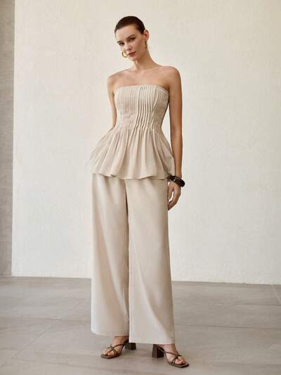 WOMEN'S APRICOT PLEATED BANDEAU TOP AND WIDE LEG PANTS 2 PIECES SET-34%