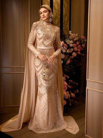 MOTF Soiréza LUXURY BEADED MERMAID HEM EVENING GOWN - ROUND NECK MAXI PARTY DRESS WITH SHEER LONG FLOWING SLEEVES FOR FORMAL EVENTS-8%