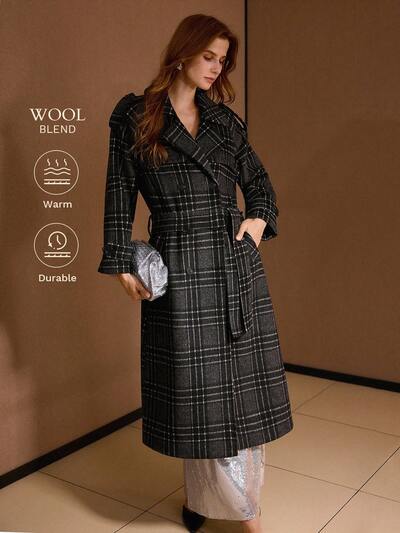 WOOL PLAID DOUBLE BREASTED BELTED OVERCOAT-40%