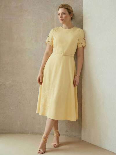 PLUS SIZE WOMEN LASER CUT EMBROIDERED FLORAL BUCKLE BELTED MID-LENGTH DRESS, SPRING/SUMMER-57%