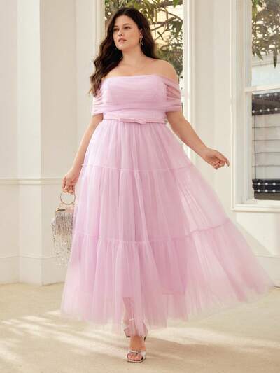PLUS SIZE WOMEN'S PINK MESH OFF THE SHOULDER FORMAL DRESS, SPRING/SUMMER
