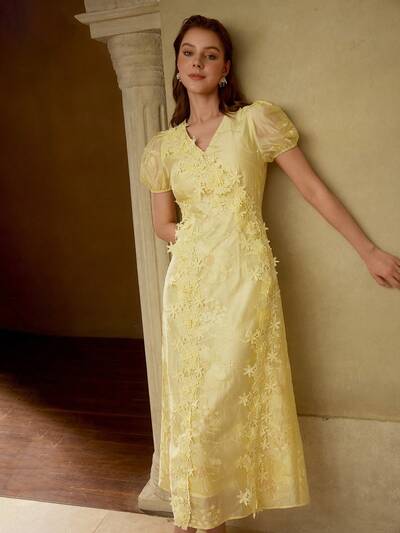 LYOCELL EMBROIDERED V-NECK PUFFED EMBROIDERY DRESS-33%