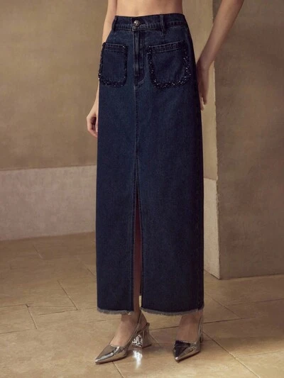 SPLIT THIGH RAW HEM DENIM SKIRT-37%