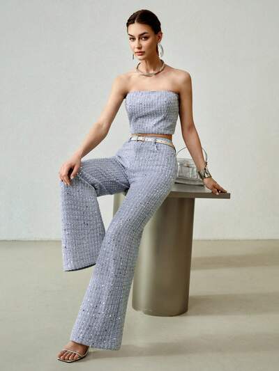 SEQUIN TEXTURE BANDEAU FASHIONABLE DENIM SET-38%