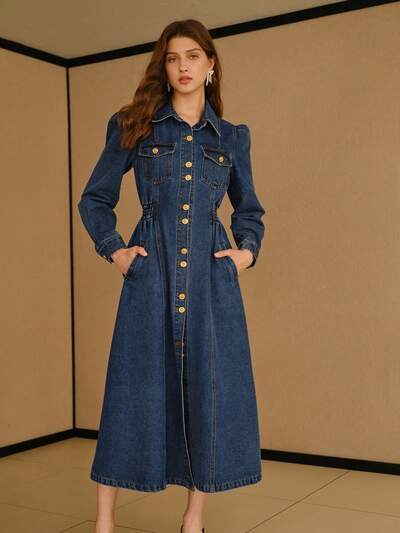 MOTF STUDIO PUFF SLEEVE FLAP POCKET SHIRRED WAIST SINGLE BREASTED PLACKET DENIM DRESS-32%