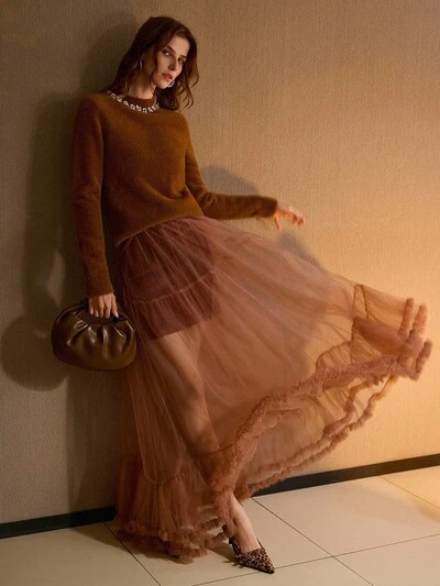 CONTRAST MESH RUFFLE HEM SKIRT-48%