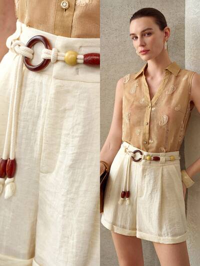 WOMEN'S SOLID COLOR LINEN BAMBOO KNOT ELEGANT VACATION BELTED SHORTS-48%