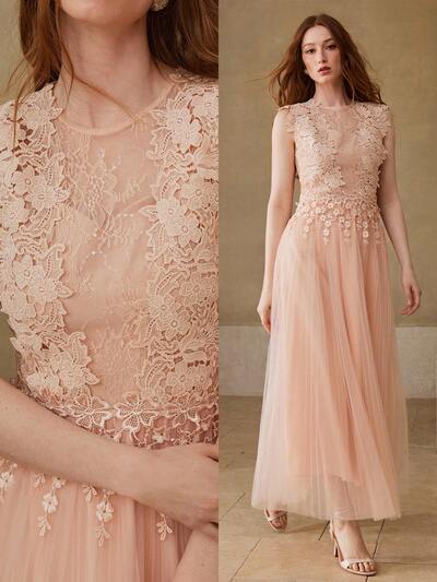 WOMEN'S SPRING/SUMMER MESH CONTRAST LACE APPLIQUE PLEATED HEM DRESS-34%