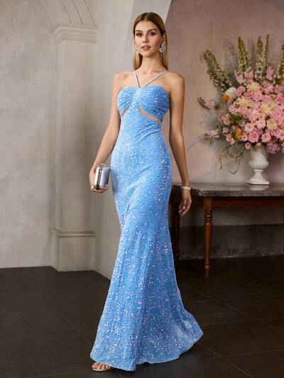 MOTF Soiréza EMBROIDERY VELVET HALTER NECK FISH TAIL FORMAL DRESS