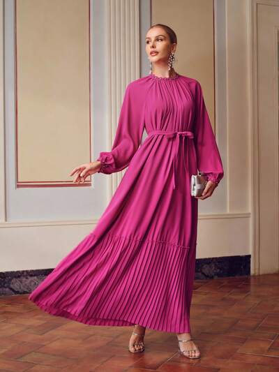 ZEYLAH RHINESTONE AND FAUX PEARL TRIM LANTERN SLEEVE PLEATED HEM BELTED LONG DRESS-46%