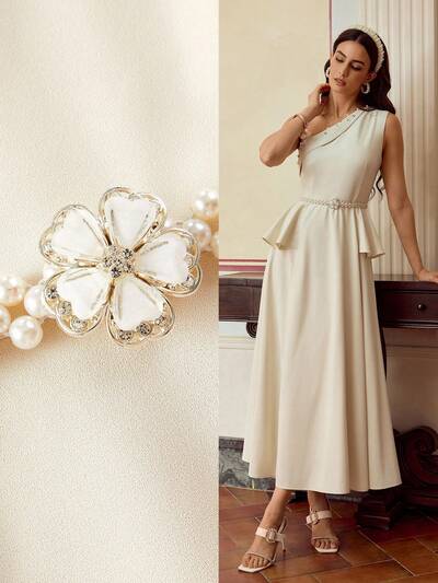 ZEYLAH WOMEN'S ELEGANT FAUX PEARL BEADED RUFFLE WAIST ONE SHOULDER DRESS-23%