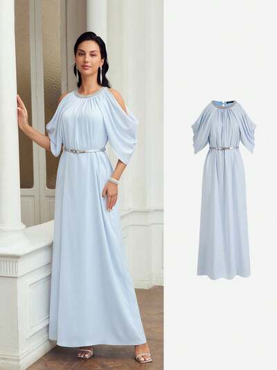 SOLID COLD SHOULDER FOLD PLEATED DRESS WITH BELT