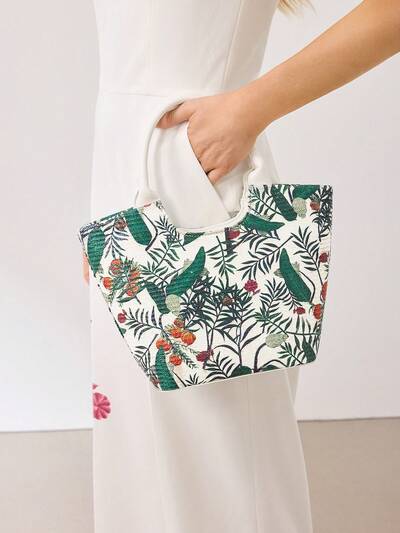 WOMEN'S PLANT PRINTED BAMBOO HANDLE TOTE BAG-25%