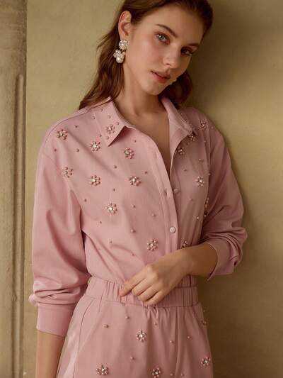 FAUX PEARL AND RHINESTONE DETAIL BUTTON UP SHIRT-32%