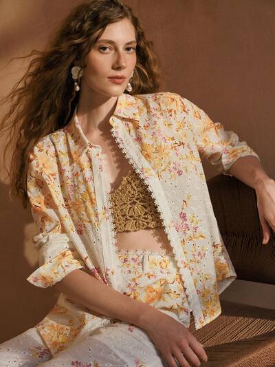 FLORAL PRINT EYELET EMBROIDERY SHIRT-48%