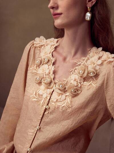 WOMEN'S LACE TRIM FLARE LONG SLEEVE STEREO FLOWER DETAIL BLOUSE, FASHIONABLE & ELEGANT-46%
