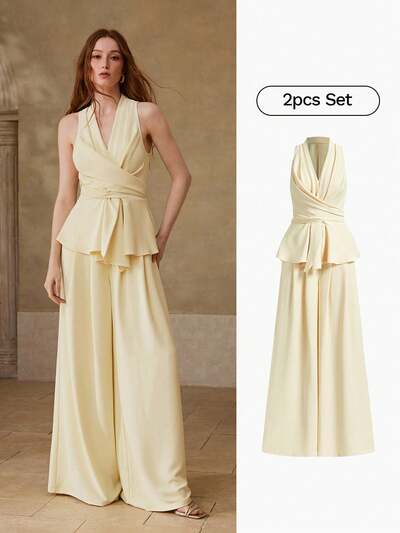 WOMEN'S SLEEVELESS TIE BACK PEPLUM TOP AND WIDE LEG PANTS 2 PIECES OUTFIT, CASUAL FOR DATES, SPRING/SUMMER-26%