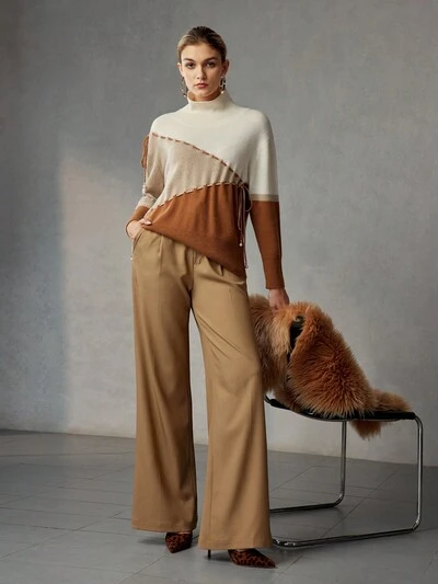 100% CASHMERE COLORBLOCK HIGH NECK DROP SHOULDER OVERSIZE KNOT DETAIL SWEATER-54%