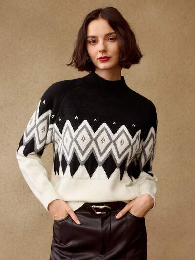 ARGYLE PATTERN MOCK NECK RAGLAN SLEEVE SWEATER-51%