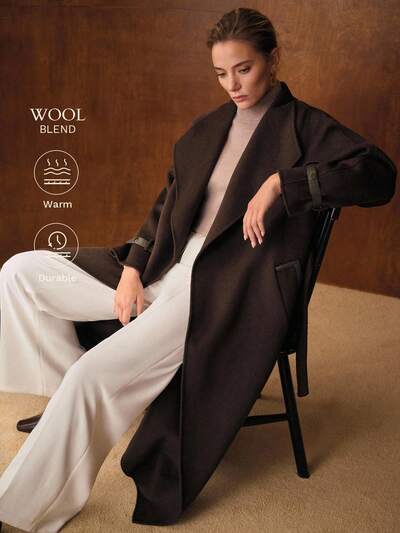 WOMEN'S SHAWL COLLAR METAL WAIST BELT HERRINGBONE TEXTURE LONG OVERCOAT-69%