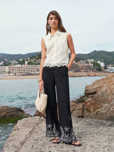 LINEN FLORAL EMBROIDERY SUIT PANTS-33%