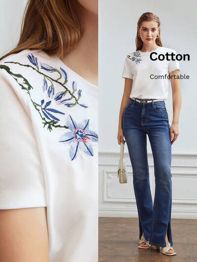 FLOWER EMBROIDERY FITTED T-SHIRT,GRAPHIC TEE