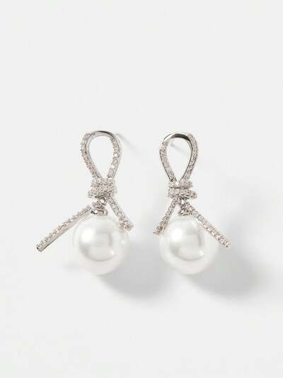 FRENCH GEOMETRIC RIBBON WRAP CUBIC ZIRCONIA FAUX PEARL EARRINGS