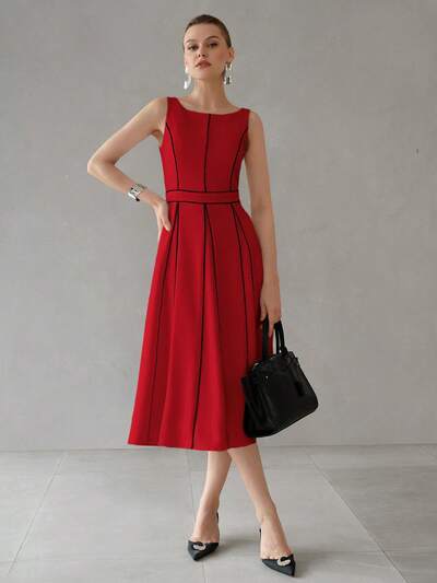 CONTRAST PIPING FOLD PLEATED MIDI DRESS