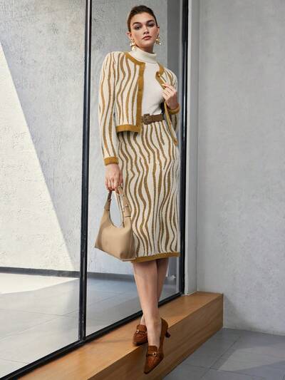 ALLOVER PATTERN CONTRAST TRIM PENCIL KNIT SKIRT WITHOUT BELT-35%