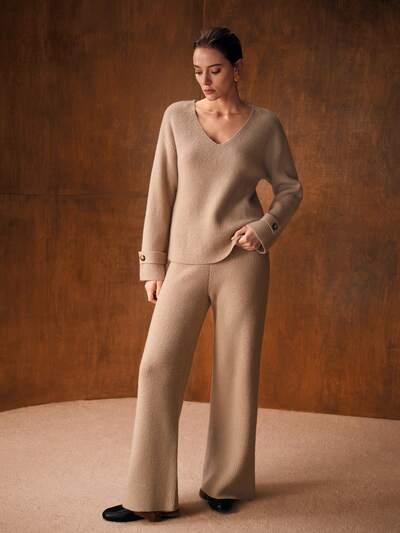 BUTTON UP V NECK TOP & WIDE LEG PANTS SWEATER SET-62%