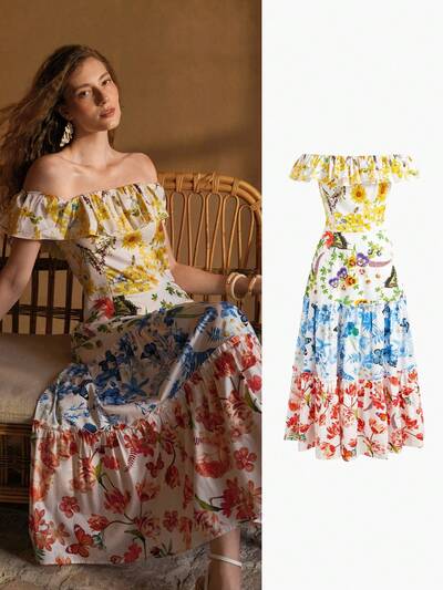 Damen Kleid aus Leinenmischgewebe mit Off-Shoulder, durchgehendem Blume Muster und ohne Gürtel-46%