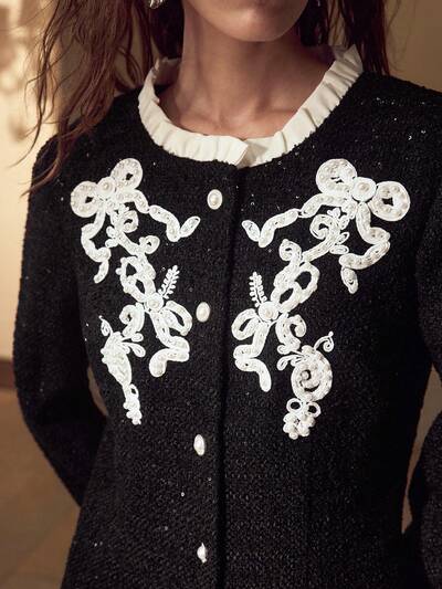 VESTIDO CORTO CON DETALLE DE VOLANTE CONTRASTANTE, BORDADO, LENTEJUELAS Y FALSAS PERLAS DE TWEED-38%