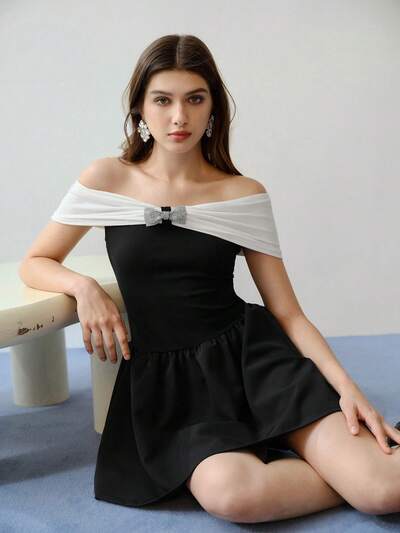 MOTF STUDIO VESTIDO MINI CON BLOQUEO DE COLOR NEGRO Y BLANCO ADORNADO CON RHINESTONES, CONJUNTO PARA EL DÍA DE SAN VALENTÍN-23%