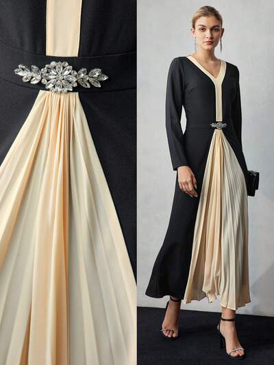 VESTIDO DE CUELLO EN V DE DOS TONOS CON CINTURA DE RINOELRANOS Y BAJO PLISADO