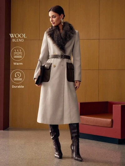 Abrigo largo con cintura ceñida, parches y cuello de lana, para otoño/invierno-48%