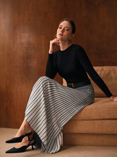 Vestido suéter de ajuste ceñido con mangas acampanadas en patrón de rayas, sin cinturón-58%