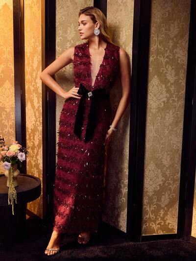 MOTF Soiréza VESTIDO ELEGANTE DE MUJER CON CUELLO EN V PROFUNDO, LENTEJUELAS Y FLECOS-26%
