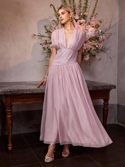 MOTF Soiréza ELEGANTE VESTIDO LARGO DE FIESTA SIN MANGAS CON CUELLO EN V PROFUNDO PARA MUJERES, DETALLES PLISADOS EN EL PECHO, ADORNOS DE STRASS EN LA CINTURA, DETALLE DE CORDÓN EN LA ESPALDA, TELA DE GASA, APROPIADO PARA AÑO NUEVO, DÍA DE SAN VALENTÍN, FIESTAS FORMALES, GALAS Y CELEBRACIONES