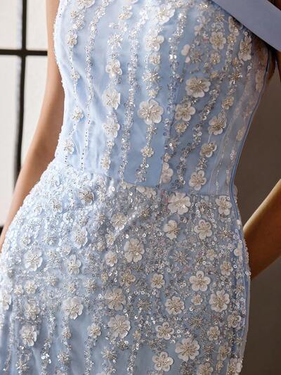 VESTIDO AZUL DE MUJER DE MALLA CON CUENTAS Y CAPAS, VESTIDO MAXI ETÉREO DE VOLANTES TRANSPARENTES, VESTIDO DE NOCHE DE PASARELA PARA BANQUETE