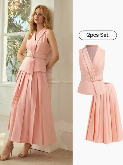Conjunto de top sin mangas con cinturón a juego + falda midi plisada, atuendo para ir al trabajo-37%