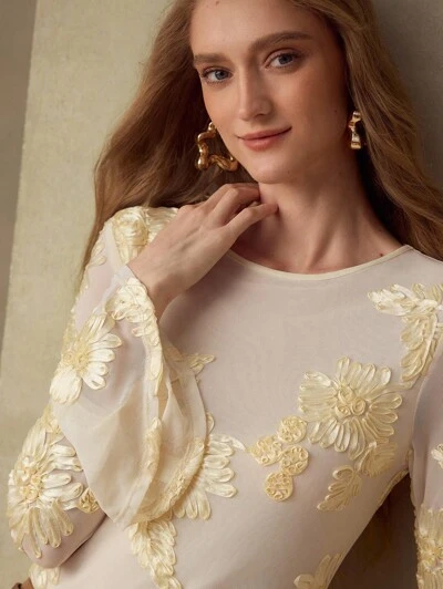 CAMISETA DE MUJER AJUSTADA DE MANGA ACAMPANADA CON BORDADO ELÁSTICO DE MALLA-32%