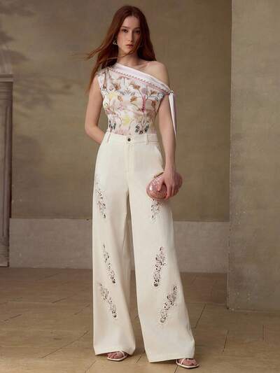 MOTF STUDIO BLUSA DE UNA SOLA MANGA CON ENCAJE DE CROCHET Y ADORNO FLORAL DE LINO PARA MUJER, ADECUADA PARA PRIMAVERA/VERANO-33%