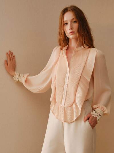 Blusa holgada con cuello mao, mangas farol, pliegues y ribete de volantes, color rosa raíz de loto-32%