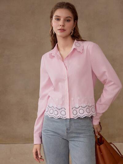 Camisa de mujer con diseño floral de encaje, parches y a rayas azul y blanco, de corte holgado