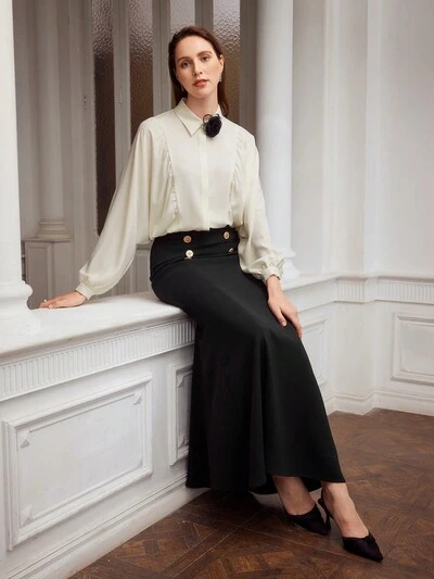 Blusa Plisada Con Botones Sólidos Y Hombros Con Pliegues-32%