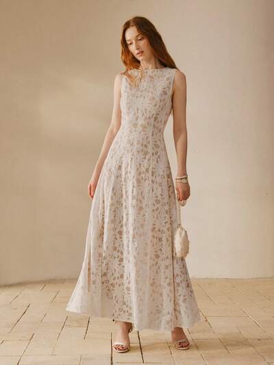 VESTIDO ELEGANTE Y ROMÁNTICO DE MUJER CON DISEÑO DE PANEL DE ENCAJE, CUELLO REDONDO, SIN MANGAS Y CINTURA ACAMPANADA PARA USO DIARIO-23%