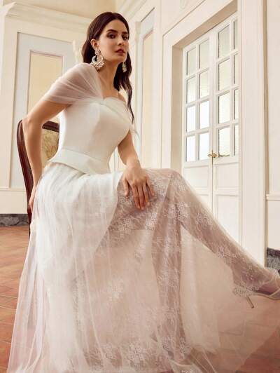 VESTIDO AZUL PLISADO CON ENCAJE DE CONTRASTE DE GASA PARA MUJER, PRIMAVERA/VERANO, SILUETA ELEGANTE Y AJUSTADA-38%